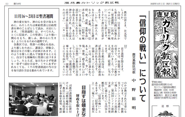 【1面】「信仰の戦い」について>鹿児島教区・中野裕明司教、目指すは健全な教会づくり>財政を取り上げた鹿児島教区評議会、11月16~23日は聖書週間、福者レオ税所七右衛門殉教祭は11月16日(日)13時30分~カトリック川内教会、屋久島教会司牧体制の変更