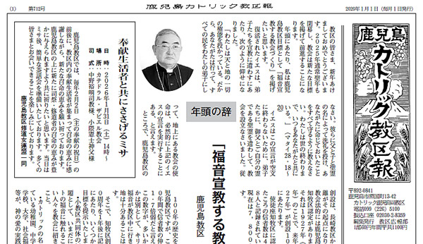 【1面】《年頭の辞》「福音宣教する教会づくり」>鹿児島教区・中野裕明司教、2026年 謹んで新春をお祝い申し上げます>鹿児島教区の聖職者、1月1日は世界平和の日、1/31奉献生活者と共にささげるミサ