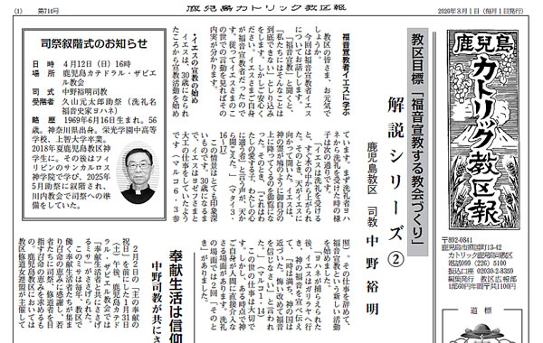 【1面】教区目標「福音宣教する教会づくり」解説シリーズ②>中野裕明司教、奉献生活は信仰の証>中野司教が共にささげるミサで説教、2月の司祭評議会、4月12日に久山助祭の司祭叙階式