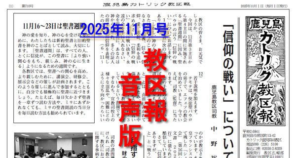 【1面】「信仰の戦い」について>鹿児島教区・中野裕明司教、目指すは健全な教会づくり>財政を取り上げた鹿児島教区評議会、11月16~23日は聖書週間、福者レオ税所七右衛門殉教祭は11月16日(日)13時30分~カトリック川内教会、屋久島教会司牧体制の変更